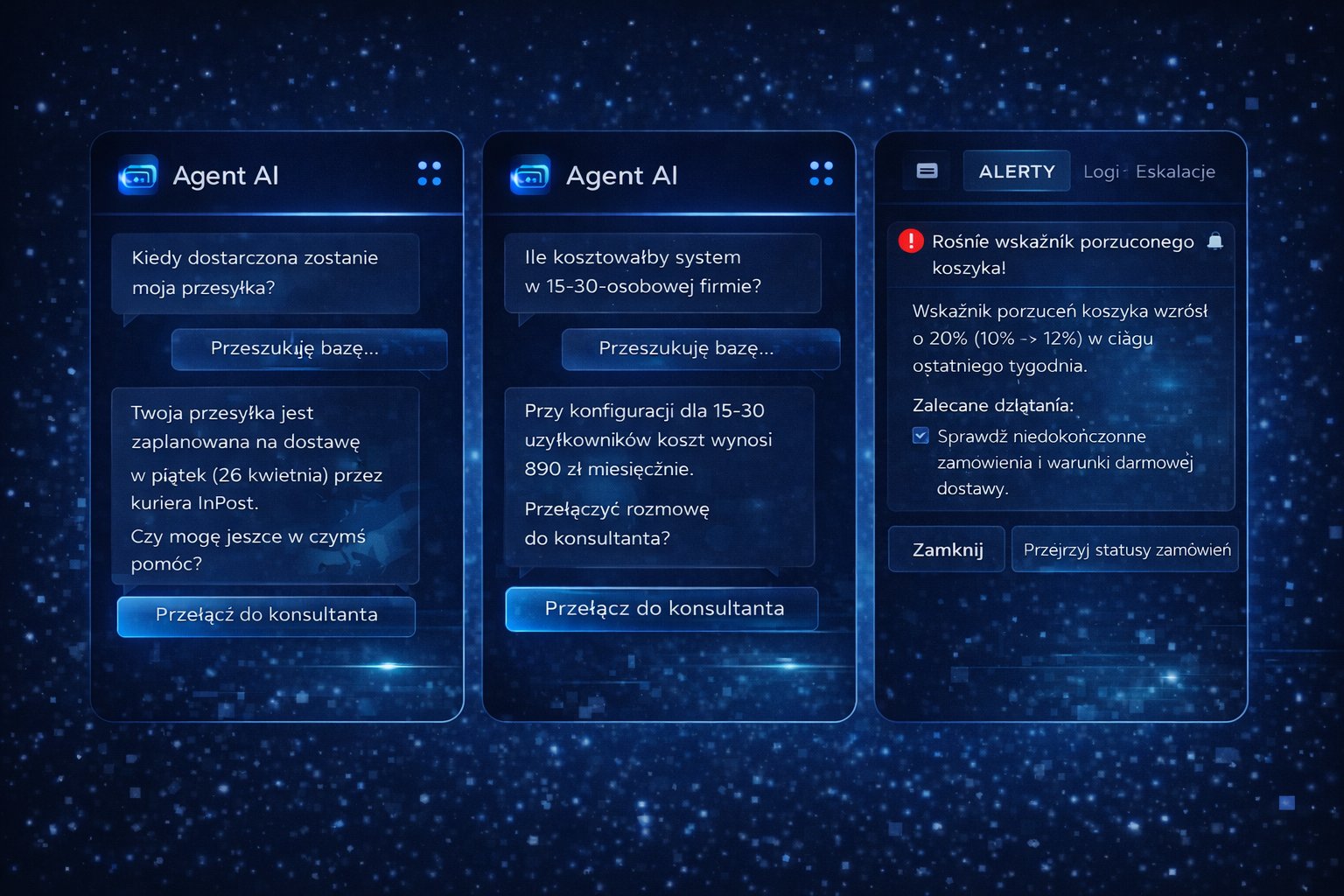 Opowiedz krótko, jaką rolę ma pełnić agent (Support / SDR / Analityka / Knowledge Base). Wrócimy z planem, zakresem pilota i wyceną.
